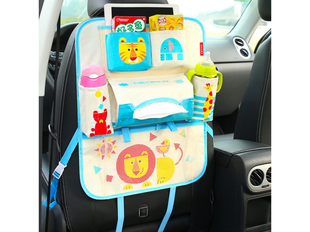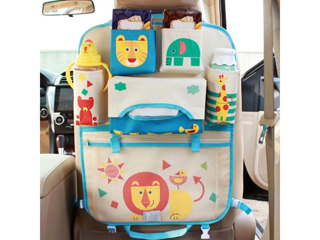 Veselý dětský organizér do auta vaše děti při jízdě zabaví. Navíc nabízí široké využití. Kapsičky na lahvičky udrží pití studené či teplé, jelikož jsou termoizolační. Dále na organizéru najdete menší kapsičky např. na svačinu. Vaše děti asi nejvíce ocení spodní kapsičku na hračky. Do této kapsičky však můžete strčit i tablet a pustit dětem pohádku.
