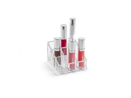 Přehledný stojánek na make-up pomůcky jako je řasenka, rtěnka, oční linky a další, z průhledného plastu