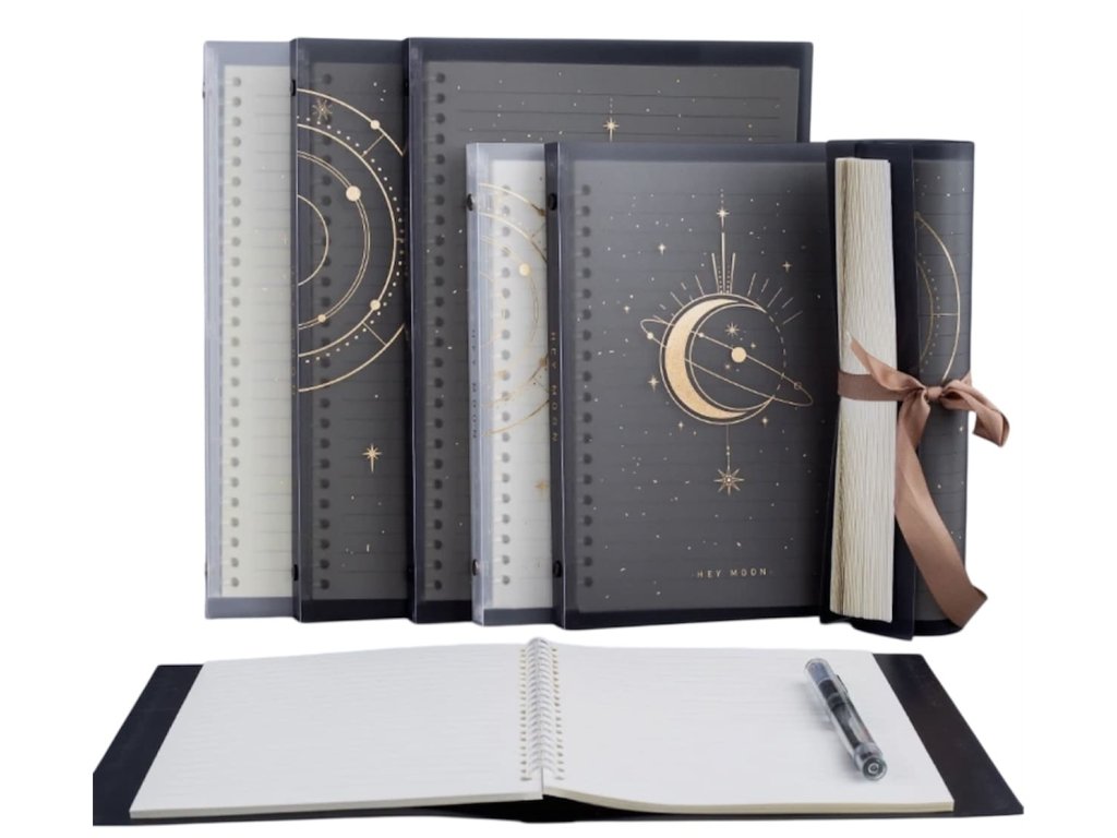 Tento krásný transparentní zápisník je ideální pro zapisování myšlenek, plánů nebo poznámek. Jeho 20 linkovaných listů s kroužkovou vazbou umožňuje snadné doplňování nebo výměnu papírů. Dotváří jej jemný motiv měsíce a hvězd na deskách, který dodává celému designu kouzelnou a tajemnou atmosféru.
